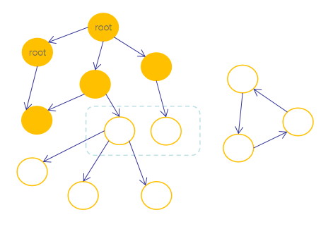 我们可以清晰的看到,在整个图片的右侧存在一个“可达孤岛”,从根出发,永远无法到达孤岛。但是垃圾回收器并没有我们这种上帝视角,它们只会根据算法会首先把根节点打上优秀员工标记。