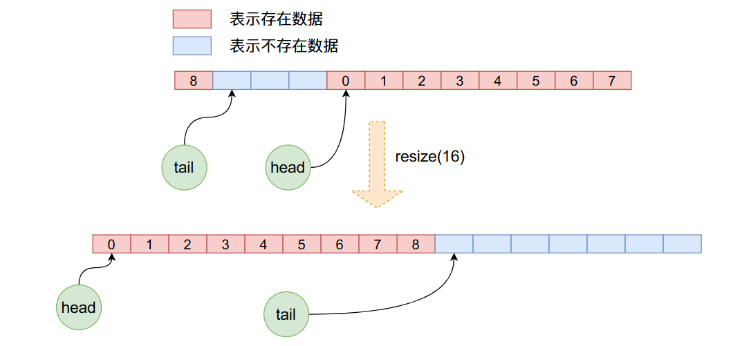 }在resize函数当中首先申请新长度的数组空间,然后将原数组的数据一个一个的拷贝到新的数组当中,注意在这个拷贝的过程当中,重新更新了head与tail,而且并不是简单的数组拷贝,因为在之前的操作当中head可能已经不是了0,因此新的拷贝需要我们一个一个的从就数组拿出来,让后放到新数组当中。下图可以很直观的看出这个过程: