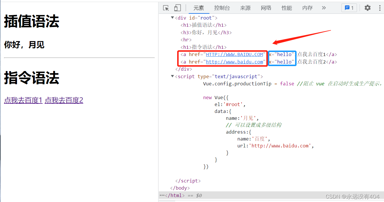 <a :href="address.url" x="hello">点我去{{address.name}}2</a>