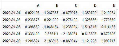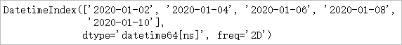 dates = pd.date_range(start='20200101',periods=5,freq='2D') pd.Series(range(10,20,2),index=dates)