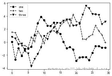 fig = plt.figure() ax = fig.add_subplot(1,1,1) ax.plot(np.random.randn(30).cumsum(),color = 'k',linestyle = 'dashed',marker = 'o',label = 'one') ax.plot(np.random.randn(30).cumsum(),color = 'k',linestyle = 'dashed',marker = ' ',label = 'two') ax.plot(np.random.randn(30).cumsum(),color = 'k',linestyle = 'dashed',marker = 'v',label = 'three') ax.legend(loc = 'best')