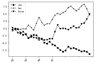 fig = plt.figure() ax = fig.add_subplot(1,1,1) ax.plot(np.random.randn(30).cumsum(),color = 'k',linestyle = 'dashed',marker = 'o',label = 'one') ax.plot(np.random.randn(30).cumsum(),color = 'k',linestyle = 'dashed',marker = ' ',label = 'two') ax.plot(np.random.randn(30).cumsum(),color = 'k',linestyle = 'dashed',marker = 'v',label = 'three') ax.set_xticklabels(['x1','x2','x3','x4','x5'],rotation = 30,fontsize = 'large') ax.legend(loc = 'best')