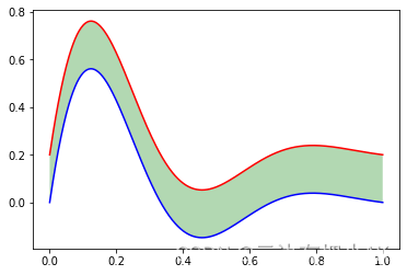 import numpy as np import matplotlib.pyplot as plt x = np.linspace(0,1,500) y1 = np.sin(3*np.pi*x)*np.exp(-4*x) y2 = y1 0.2 plt.plot(x,y1,'b') plt.plot(x,y2,'r') plt.fill_between(x,y1,y2,facecolor = 'green',alpha = 0.3) plt.show()