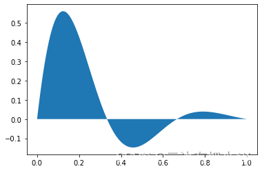 import numpy as np import matplotlib.pyplot as plt x = np.linspace(0,1,500) y = np.sin(3*np.pi*x)*np.exp(-4*x) fig,ax = plt.subplots() ax.fill(x,y) plt.show()