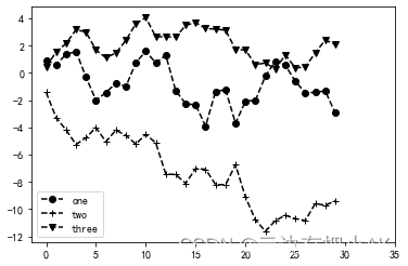 fig = plt.figure() ax = fig.add_subplot(1,1,1) ax.plot(np.random.randn(30).cumsum(),color = 'k',linestyle = 'dashed',marker = 'o',label = 'one') ax.plot(np.random.randn(30).cumsum(),color = 'k',linestyle = 'dashed',marker = ' ',label = 'two') ax.plot(np.random.randn(30).cumsum(),color = 'k',linestyle = 'dashed',marker = 'v',label = 'three') ax.set_xticks([0,5,10,15,20,25,30,35]) ax.legend(loc = 'best')