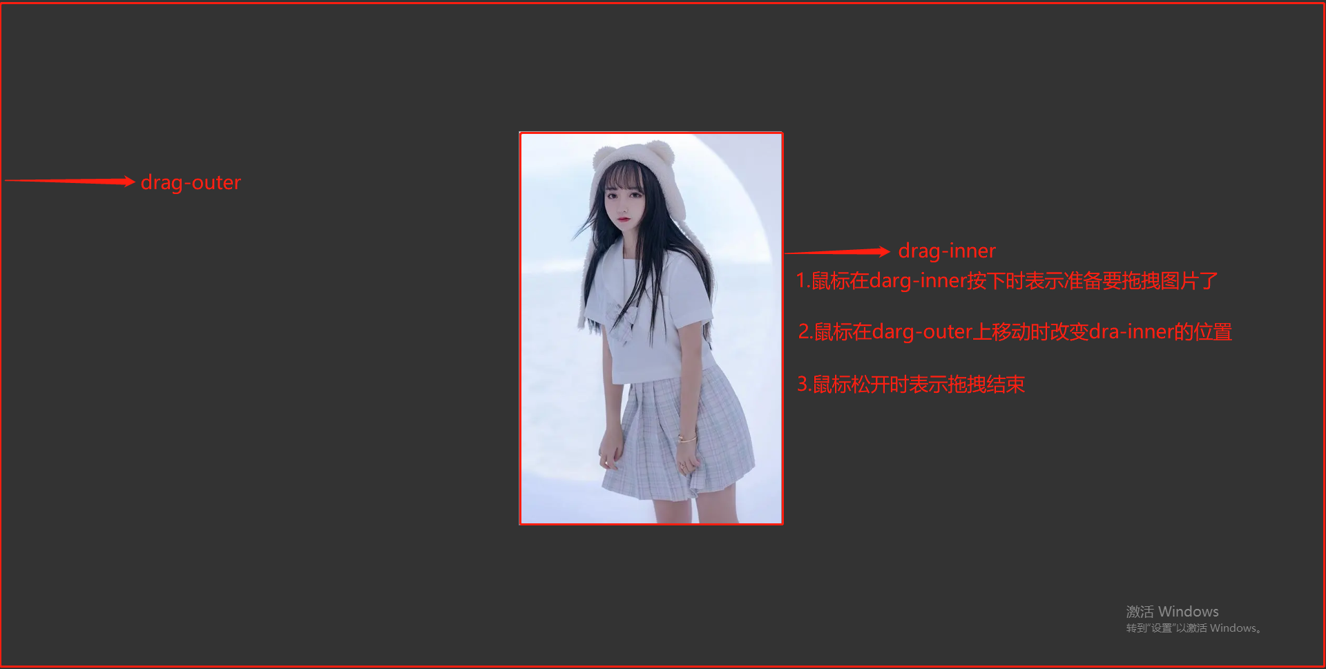 3.样式部分我们设置外层drag-outer用flex布局让里面元素快速居中, user-drag: none;禁用图片等元素的可拖拽属性。