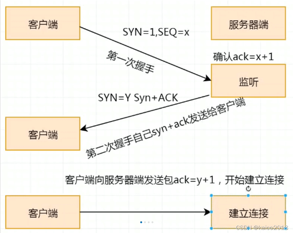 2.第二次握手:服务器端确认收到syn和X值,回复给客户端ack=x 1和seq = y (随机数)发送给客户端。