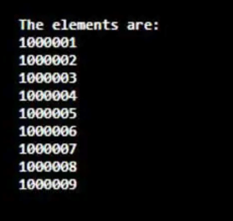// Display the elements in the range mentioned as 1000001L and 1000010L where 1000001L is included and 1000010L is excluded
