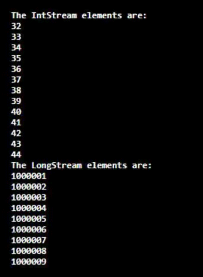 导入包java.util.stream.IntStream 和 java.util.stream.LongStream。然后,创建IntStreamstr和LongStreamst以向其中添加元素。在创建流期间,使用方法range(32,45)在IntStream中添加元素,其中包括32,排除45。同样,使用方法range(100001L、100010L)在LongStream中添加元素。在执行代码时,序列有序IntStream将从32返回到44,LongStream将通过增量步骤1从100001L返回到100010L。