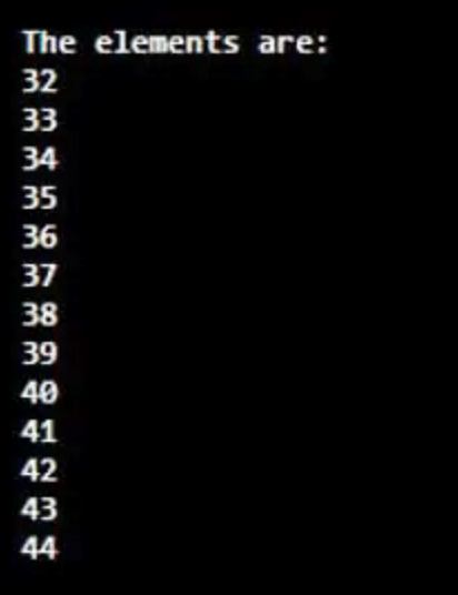 // Display the elements in the range mentioned as 32 and 45 where 32 is included and 45 is excluded
