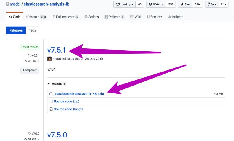 ElasticSearch 主要是用于自己 blog 或者公众号文章的搜索使用,所以需要选择一个中文分词器配合使用,这里刚开始推荐使用 IK 分词器,下面开始安装对应 ElasticSearch版本 (7.5.1) 一致的插件: