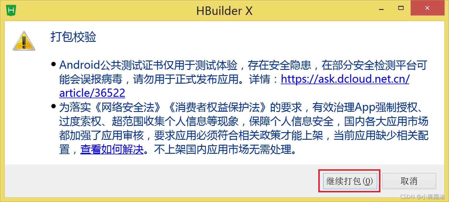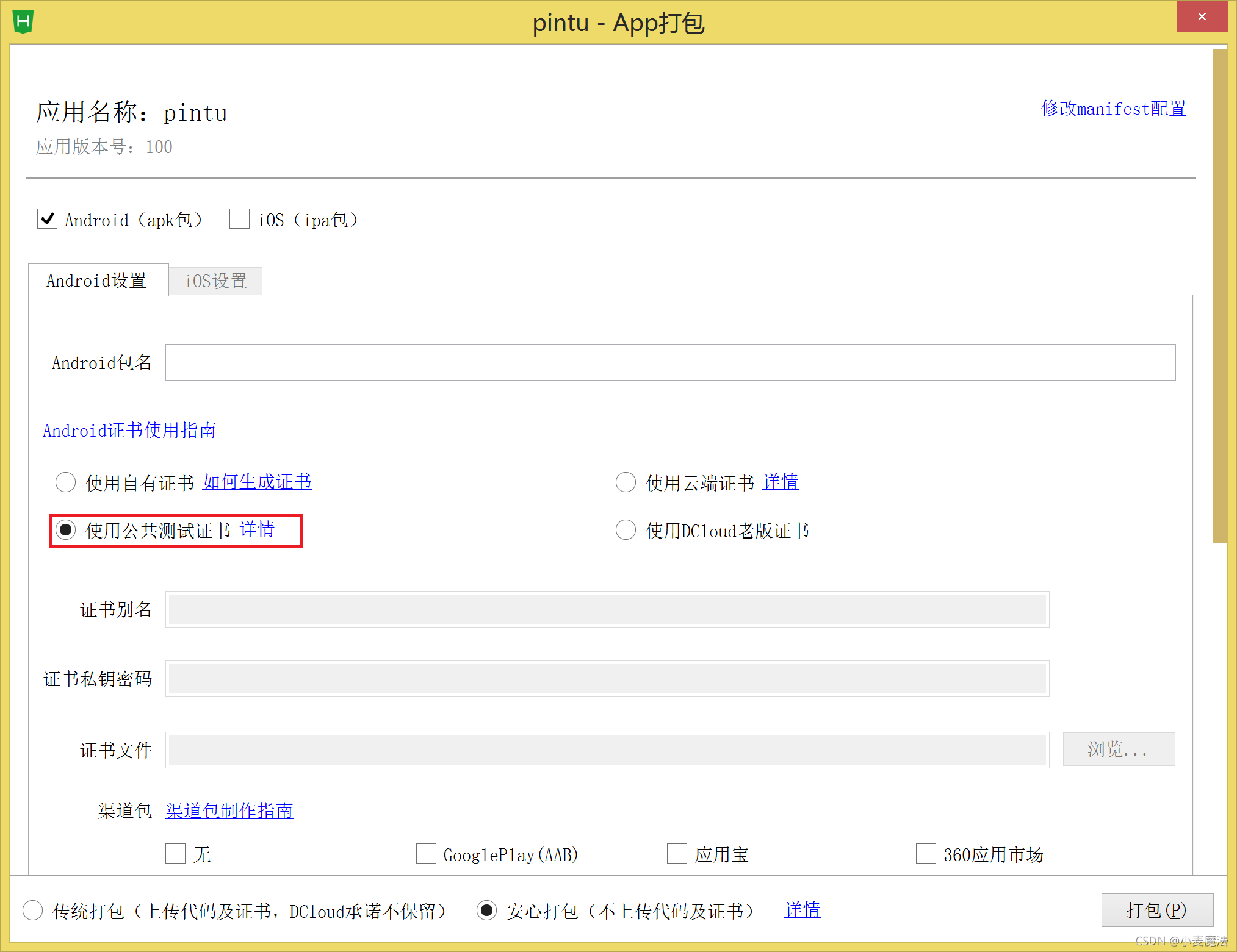 选择【使用公共测试证书】。去掉广告的勾。按下【打包】
