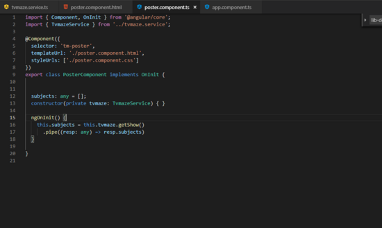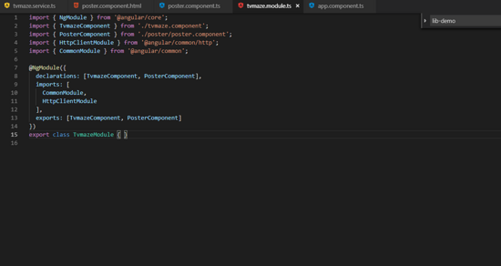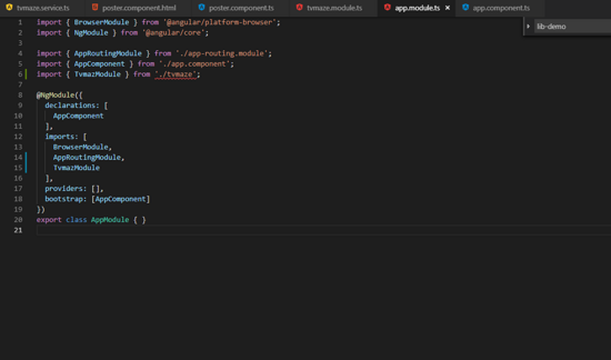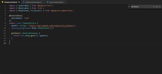 我们会发现tvmaze有它自己的 package.json , tsconfig.json , tslint.json 和 karma.conf.js ,这样建立是有原因的,因为这个项目独立与主应用建立而成,它本身也有组件、服务、模块。稍后我们添加其他的内容。现在我们添加一些逻辑: