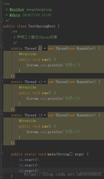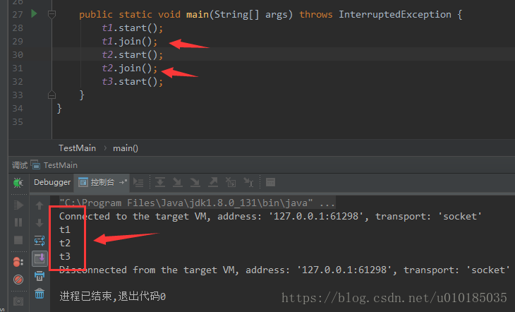 但是需要说明的是,这里的等待绝对不是等待调用者,而是阻塞的主线程,t1,t2,t3只是子线程,当子线程运行完毕后,主线程结束等待。