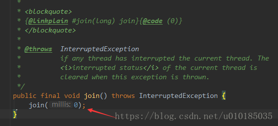 进入join源码后,首先看到的是一个传入0参数的join方法,此处选择继续进入。