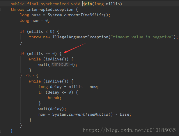 首先可以看到join方法是线程安全的,其次可以结合上图一起看,当传入参数为0时,会命中一个wait(0)的方法,有经验的同学应该能直接看懂,这里表示等待。
