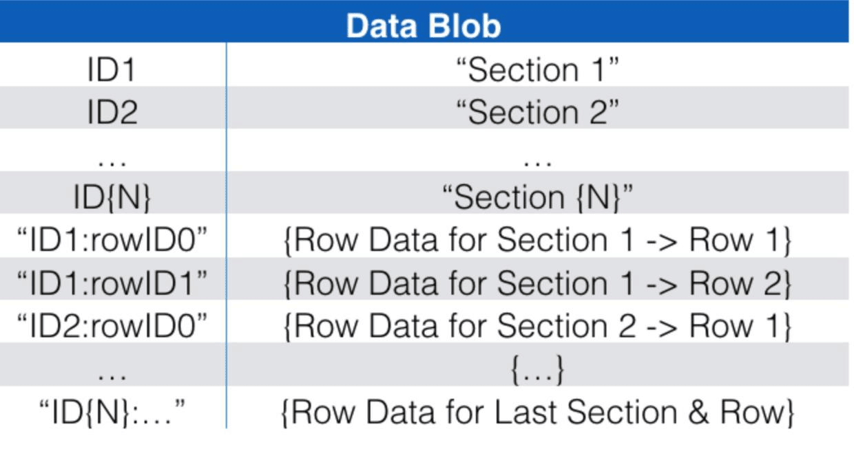 DataBlob按照一定的格式组织二维数据,如上左图。DataBlob首先存储数组的第一维section并为其分配ID,例如将上面的一维数组的"title":"A",存储为DataBlob[0]="title":"A",分配sectionID为0,"title":"B",存储为DataBlob[1]="title":"B",分配ID为1......以此类推。