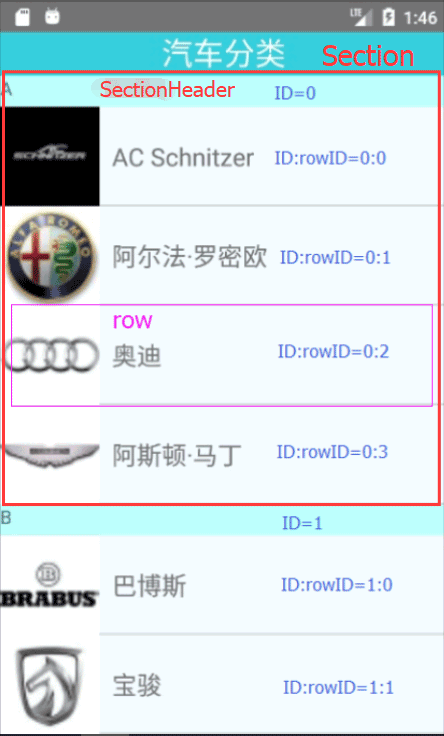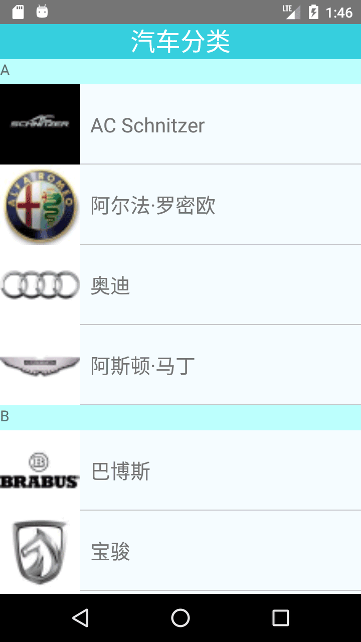 其中data数组的一维元素中包含title与cars,而cars又是一个数组。使用ListView将其渲染为上面右图所示按首字母分类的列表。