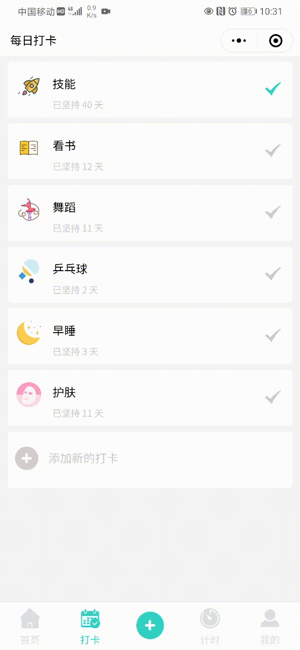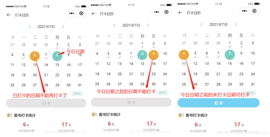 打卡实现的功能:可打卡的日期为今日日期或今日日期之前未打卡过的日期。