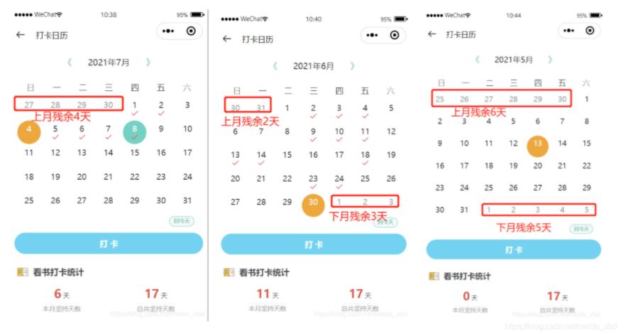 【结论】打卡日历页面存在展示35个或42个日期数据的情况,35个或42个日期数据=当前显示月所有日期数据 上月残余尾部日期 下月残余头部日期。