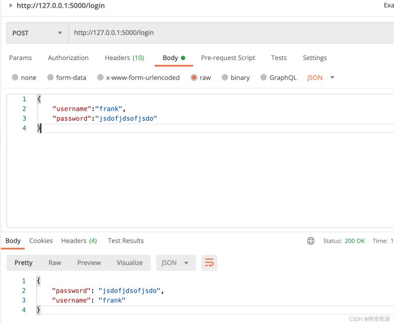 curl --location --request POST 'http://127.0.0.1:5000/login' \ --header 'Content-Type: application/x-www-form-urlencoded' \ --data-urlencode 'username=frank' \ --data-urlencode 'password=jsdofjdsofjsdo'