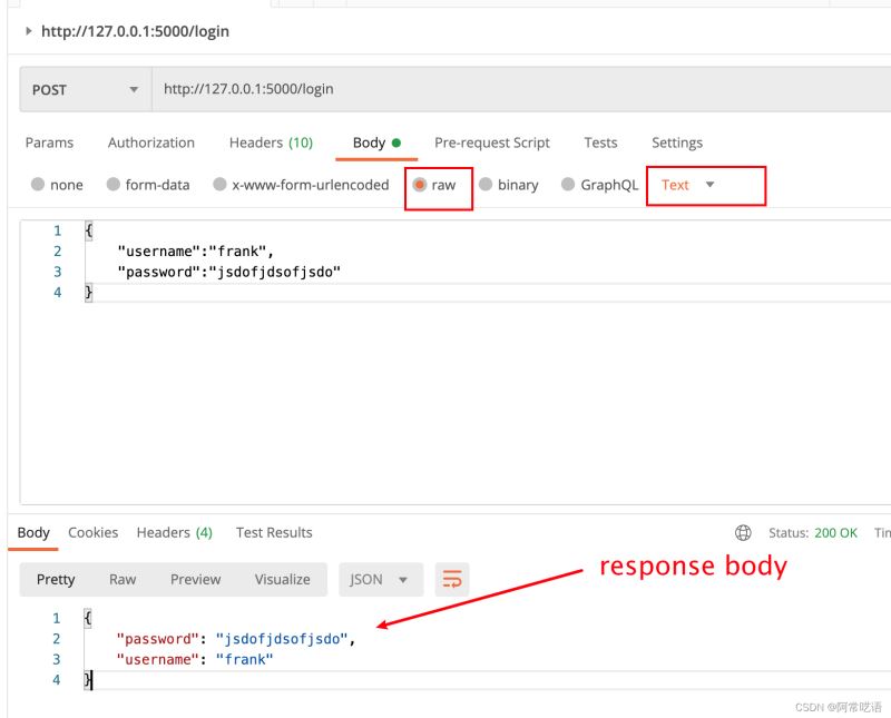 POST /login HTTP/1.1 Host: 127.0.0.1:5000 Content-Type: application/x-www-form-urlencoded Content-Length: 38 username=frank&password=jsdofjdsofjsdo