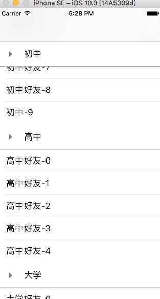 可以从上面代码看到, 创建了一个tableView. 并根据数组个数给分区数量赋值, 然后在tableView: viewForHeaderInSection:方法里, 用一个自定的view给分区头视图赋值. 在tableView: cellForRowAtIndexPath:方法里给每个分区对应的cell进行了赋值. 先看一下效果.