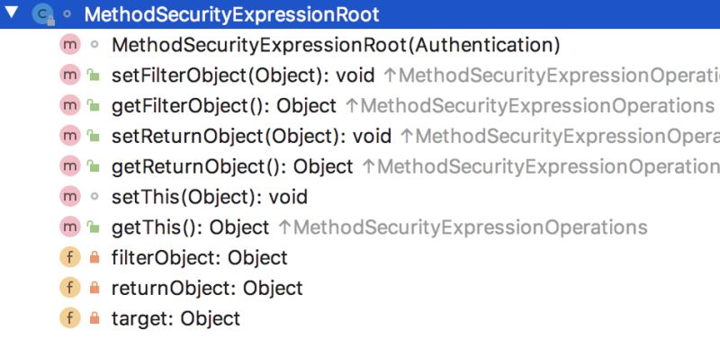 MethodSecurityExpressionRoot 类实际上继承自 SecurityExpressionRoot,只不过增加了过滤对象以及返回值对象。我们来看下 MethodSecurityExpressionRoot 的方法摘要: