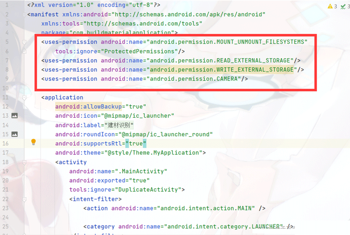 READ_EXTERNAL_STORAGE 读取外部存储空间WRITE_EXTERNAL_STORAGE 写入外部存储空间CAMERA 相机权限