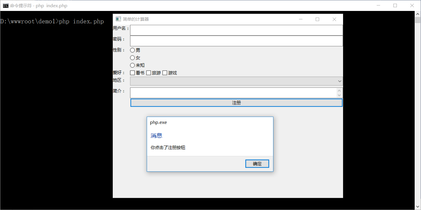 $this->win->msg('消息', '你点击了注册按钮');