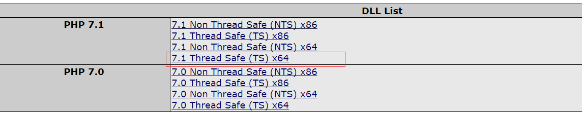 由于我的系统是64位win10,php版本是7.1,所以选择7.1 Thread Safe (TS) x64,linux用户可以自行下载源码包,编译安装。