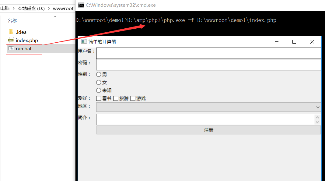 注意php.exe的路径和运行脚本路径,保存为run.bat,运行结果如下: