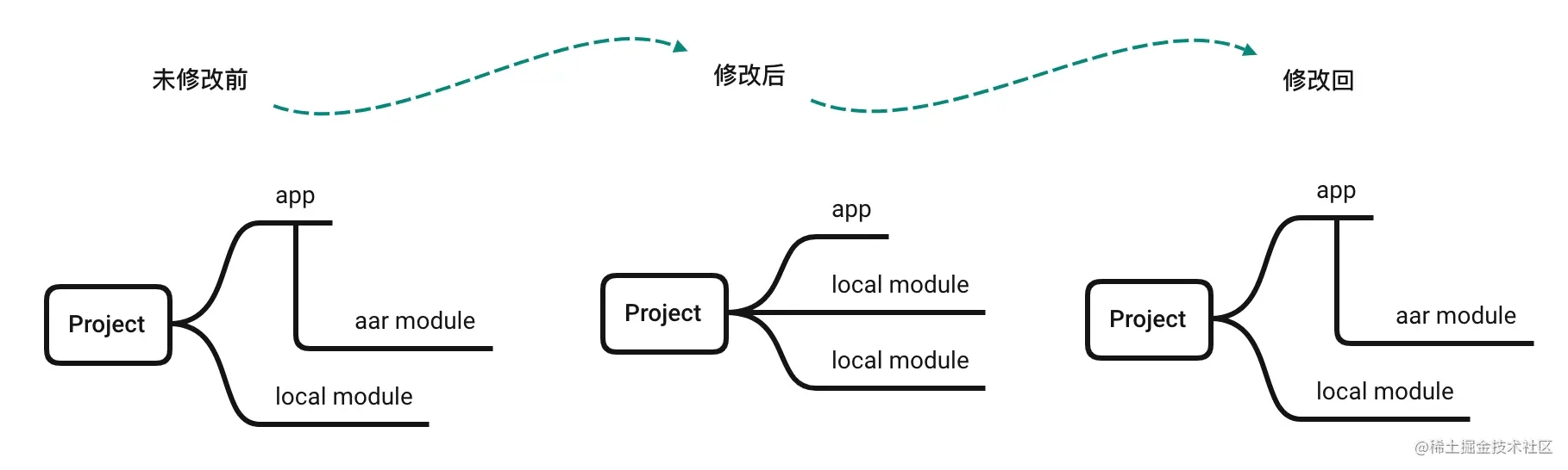 我们在多模块项目开发过程中,会遇到这样的场景,工程里依赖了一个自己的或者其他同事的 aar 模块,有时候为了开发调试方便,经常会把 aar 改为本地源码依赖,开发完毕并提交的时候,会再修改回 aar 依赖,这样就会很不方便,开发流程图示如下: