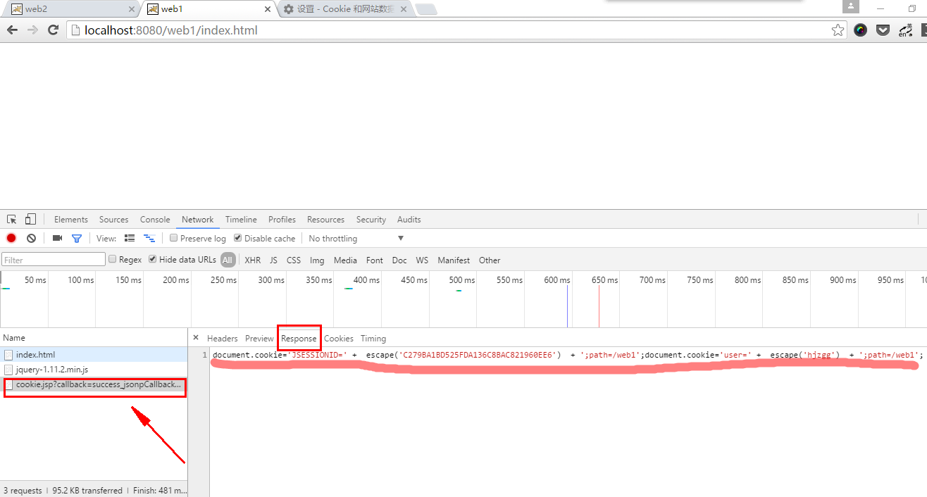 至此,通过jsonp方式的请求完成cookie跨域携带,也就是web1工程成功拿到了web2工程目录下的cookie。可以发现,jsonp会通过回调函数来处理服务器端返回的数据,因为返回的可以执行的js代码(也就是重写cookie的path和域),然后自动执行返回的js代码,从而达到目的。