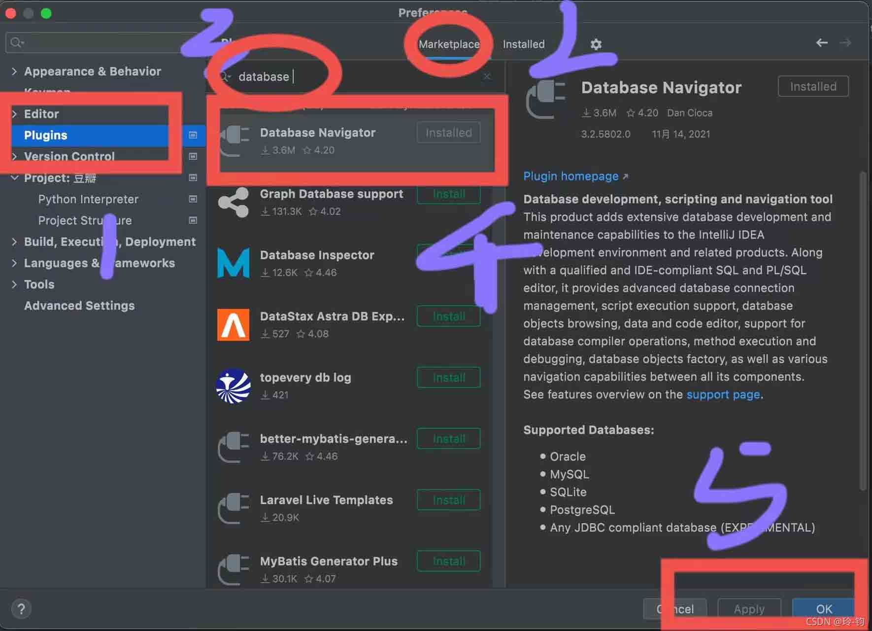 2、选择plugins->marketplace->搜索database->选择Database Navigator插件->下载->ok