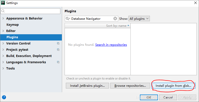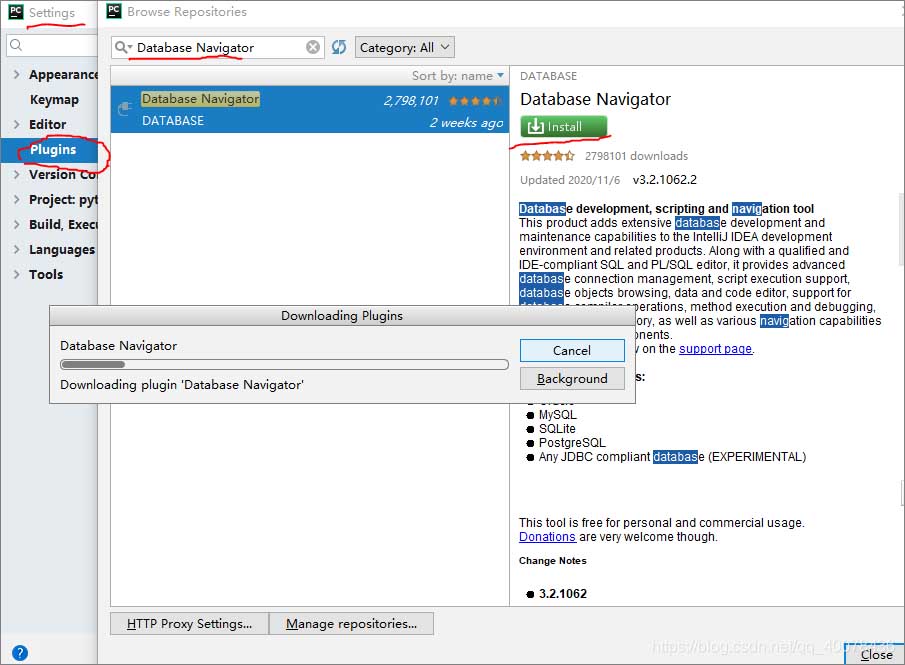 菜单File->Settings->Plugins,搜索框中输入:Database Navigator -> Install,实现在线安装。安装完成后重启Pycharm即可。