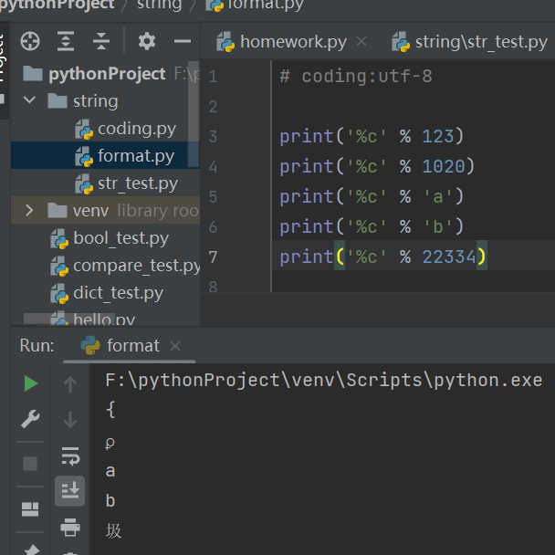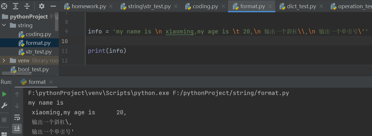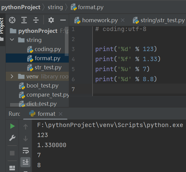 使用操作符%来实现,左侧是一个字符串,中间包含了格式符(可以有多个);右侧是一个元组,元素为替换左侧格式符的变量。
