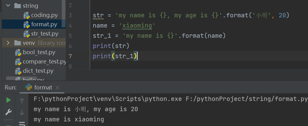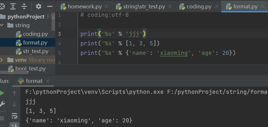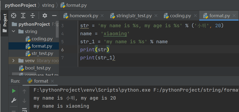 str = 'my name is %s,my age is %s' % ('xiaoming', 20)如果左侧只有一个%,则右侧不需要用()包裹:
