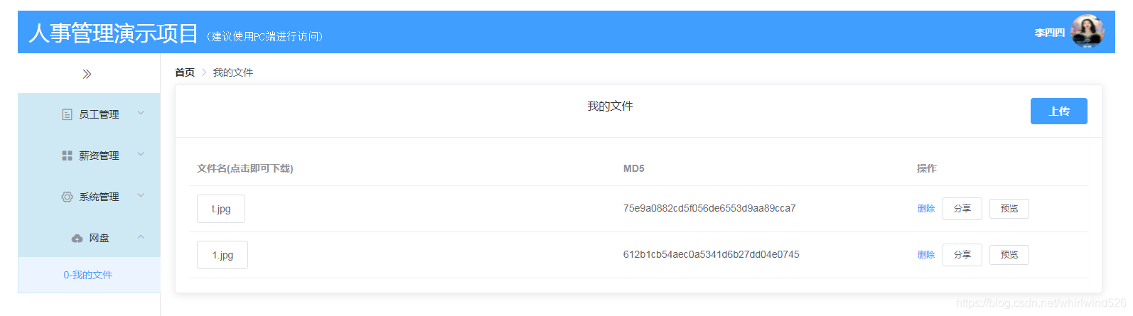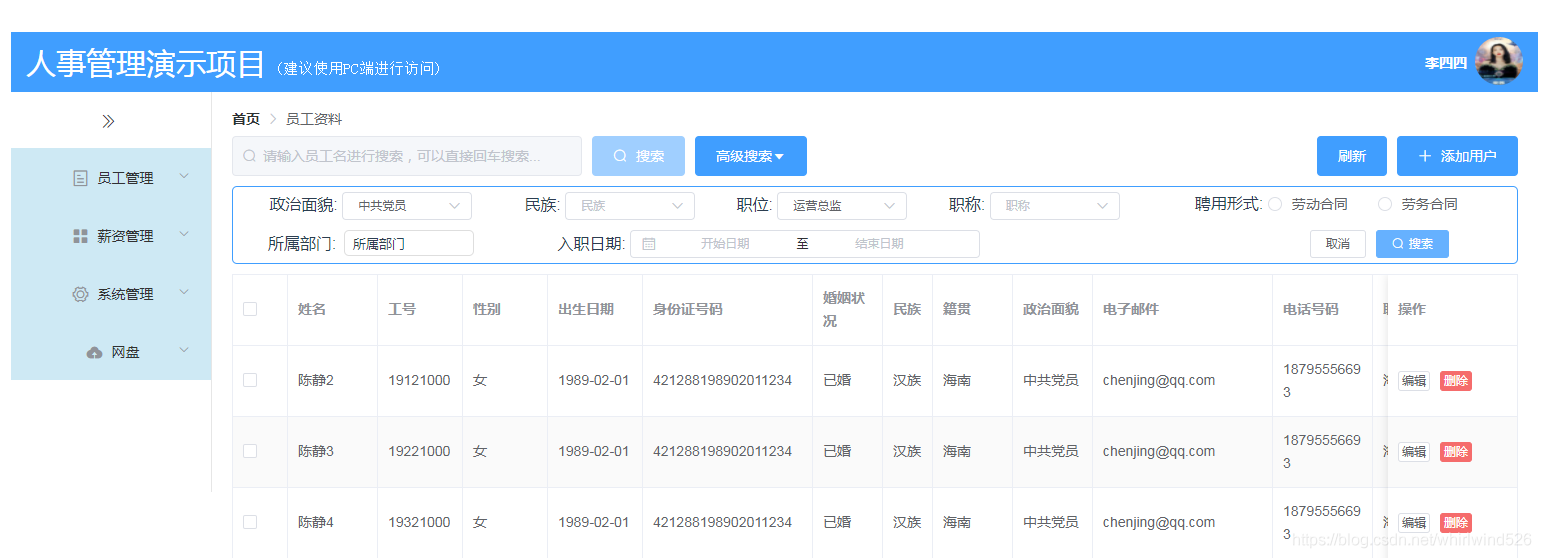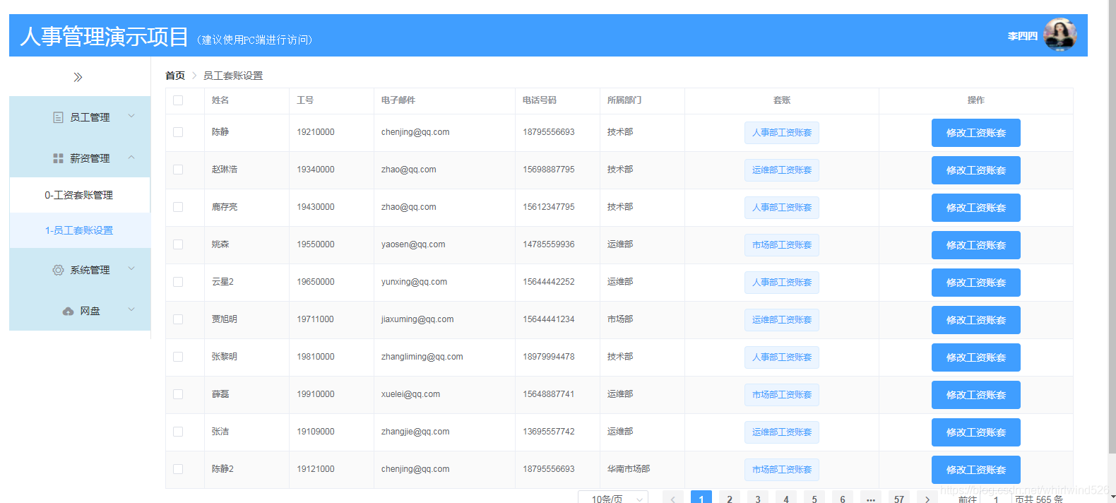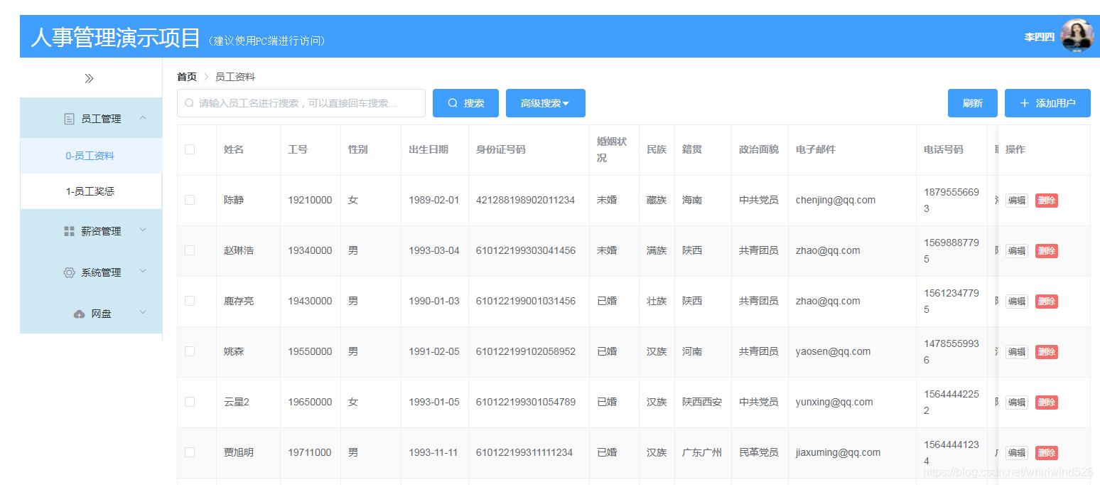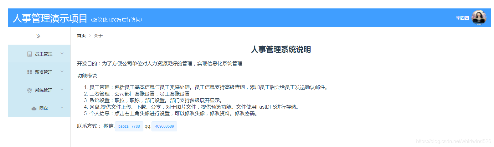 系统是前后端分离的项目,直接启动Springboot应用程序类后,再启动前端工程访问即可。主要实现了企业的人事管理功能,主要包含员工管理、薪资管理、职位管理、权限管理、网盘文件分享管理等模块。