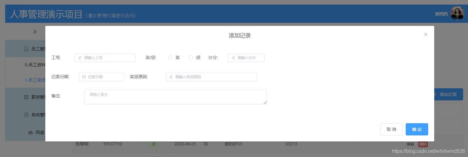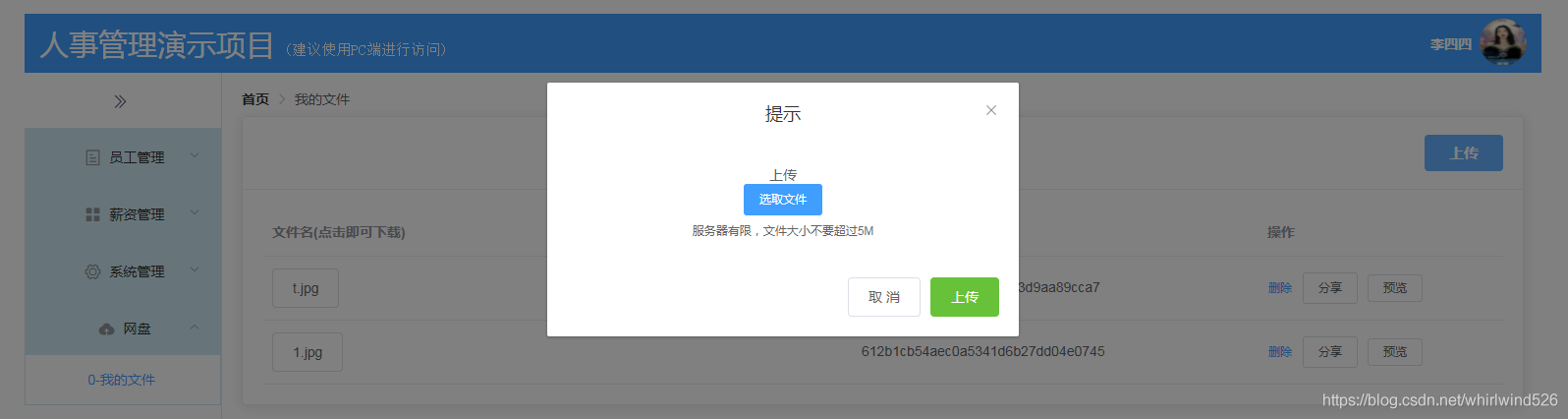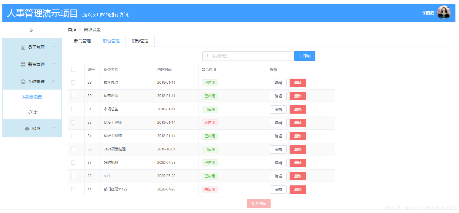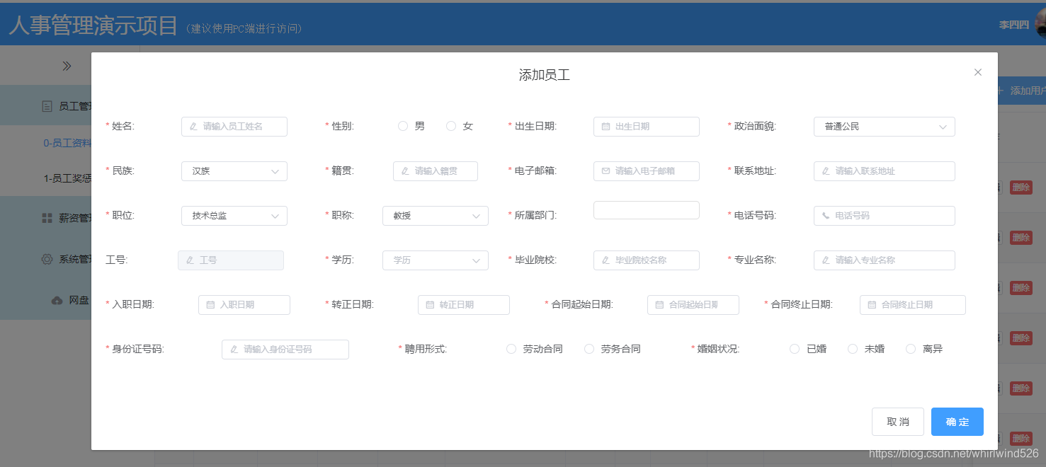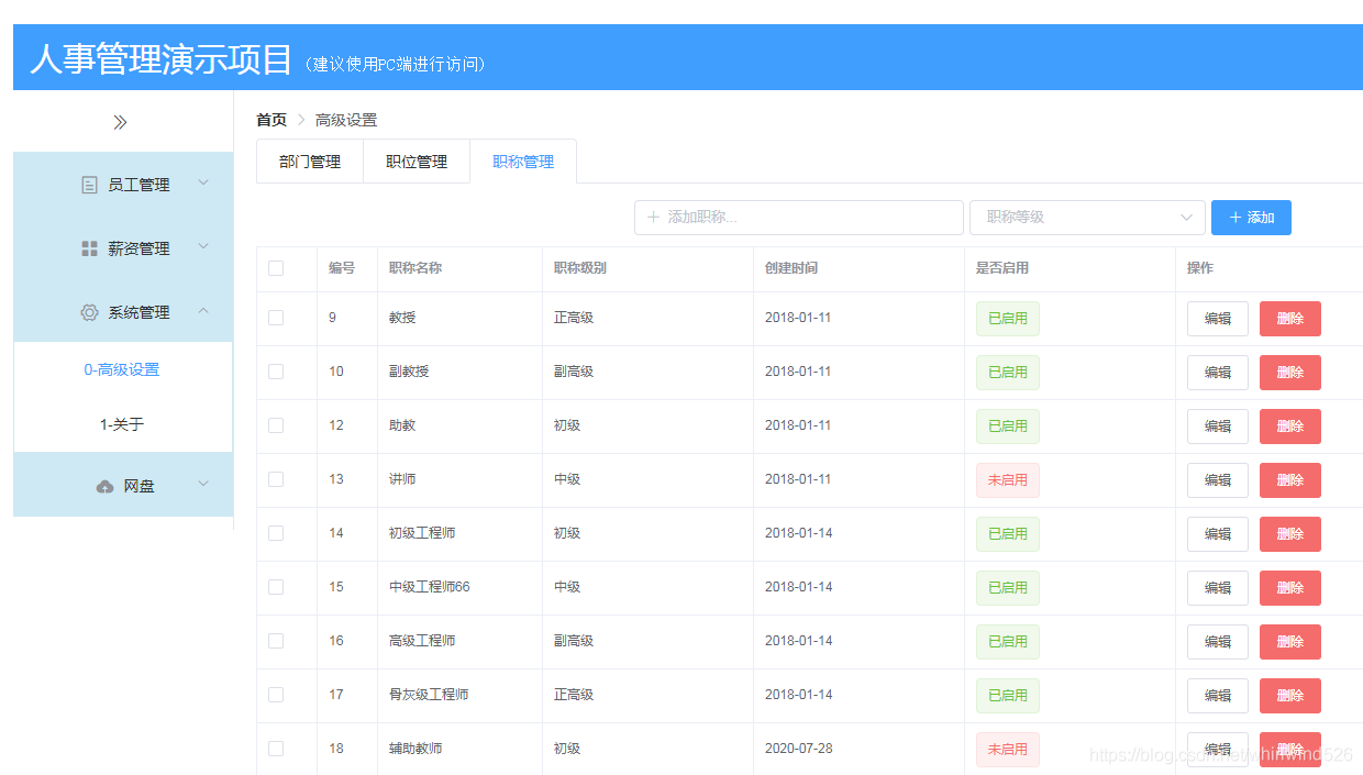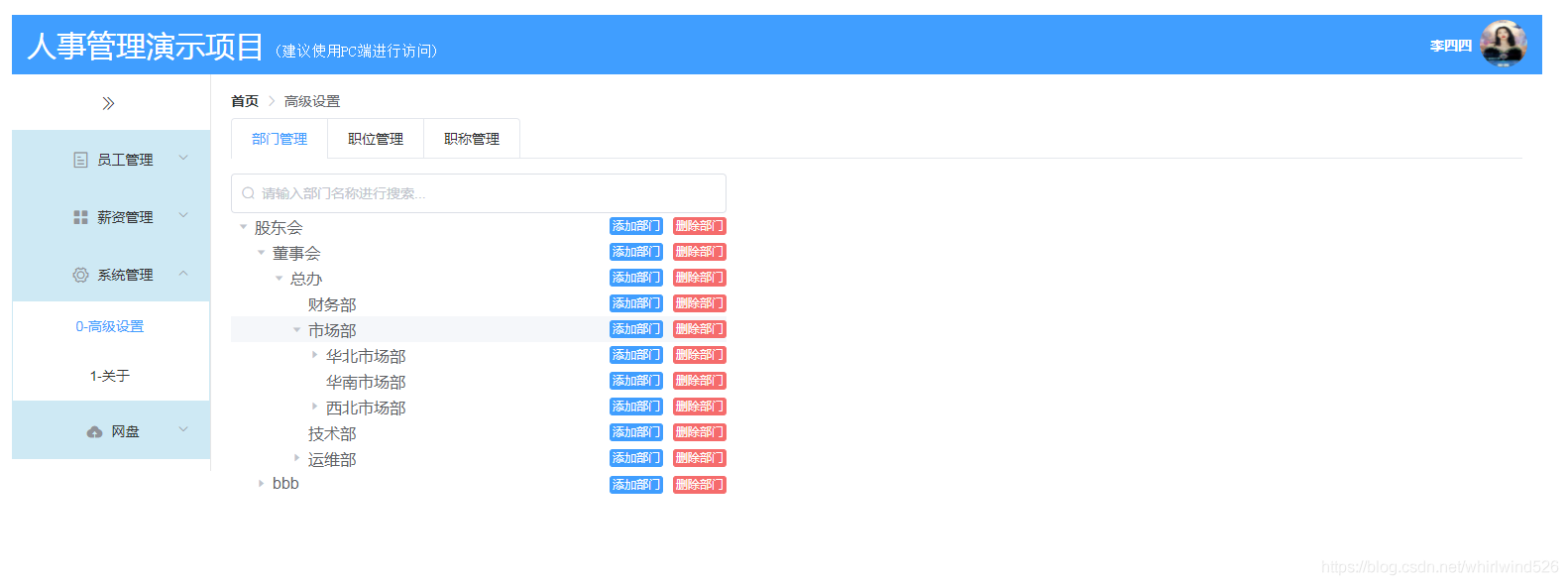 系统是前后端分离的项目,直接启动Springboot应用程序类后,再启动前端工程访问即可。主要实现了企业的人事管理功能,主要包含员工管理、薪资管理、职位管理、权限管理、网盘文件分享管理等模块。