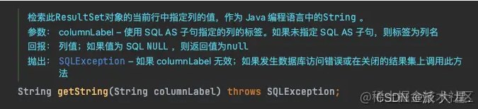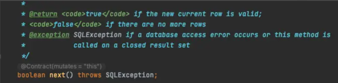 解释: 将光标从其当前位置向前移动一行。 ResultSet 游标最初位于第一行之前;第一次调用 next 方法使第一行成为当前行;第二次调用使第二行成为当前行,依此类推。实则对查询到的数据进行遍历操作