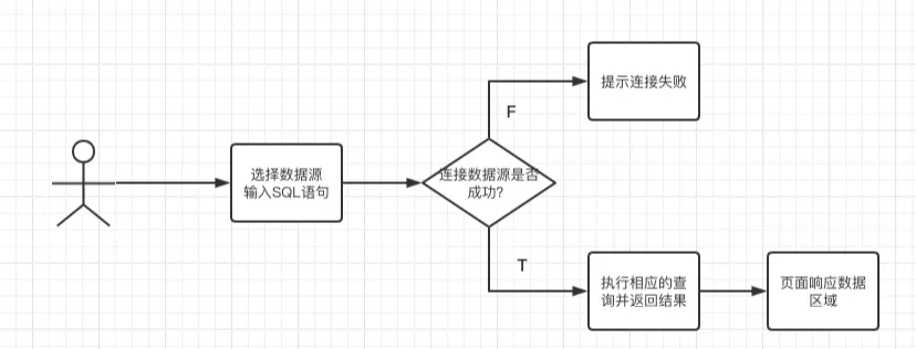 }经过对操作者输入的SQL即可完成对表的查询操作,由于所要实现的是可动态切换数据源从而进行相关的查询操作,所以在此操作逻辑中首先需要连接数据库,后再对输入的SQL进行分割查询等操作。合并后的完整代码: