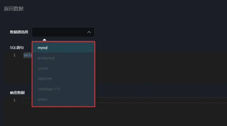 使用者在页面可以选择切换需要操作的数据源,并在编辑区域内输入SQL语句进行查询,查询语句可以是全表查询表中所有字段或者根据所需查询指定某几列字段对应的值,点击查询之后即可在响应数据之后以JSON的格式将查询到的每一条数据封装一个对象最后显示到响应数据区域以供操作者进行观看以达到可视化工具的效果。