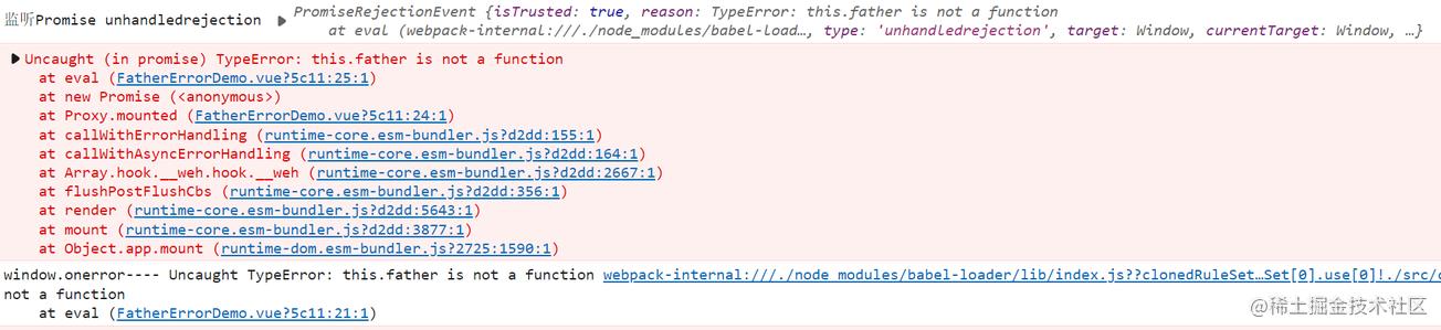 // 根组件的errorCaptured会执行两次,先捕获FatherErrorDemo钩子自身的错误,然后捕获childErrorDemo的错误