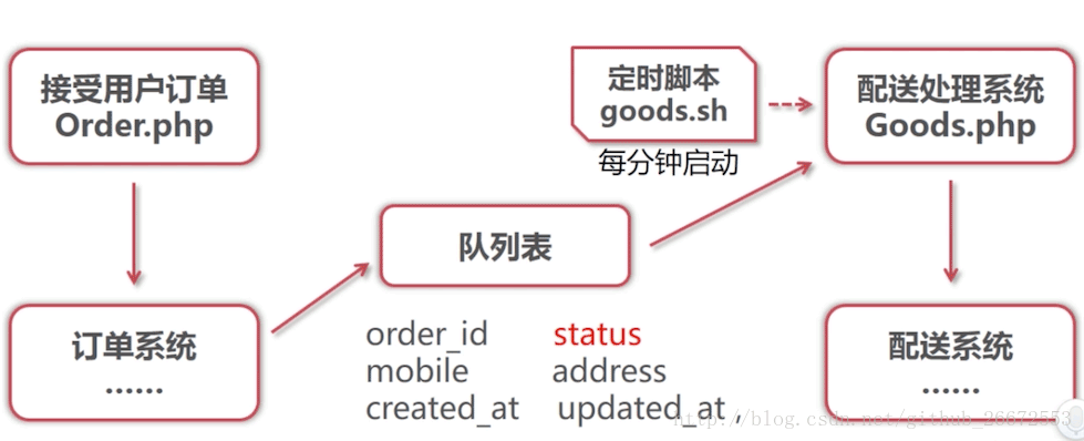 大致流程:order.php来接收用户订单,生成订单号并对订单进行处理(订单系统);在订单系统会把配送系统所需要的数据放入队列表中;我们的配送系统goods.php会有个定时脚本每分钟执行一次,处理队列表中的数据。