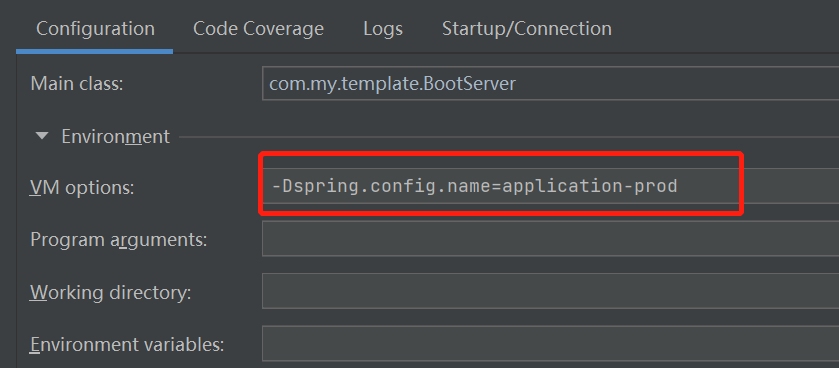 上面也提到可以使用"spring.config.name"属性来决定使用哪个配置文件,“spring.config.name”可以配置在JVM参数和环境变量处,且JVM参数的优先级大于环境变量的。下面尝试下,直接配置在JVM参数处,演示下效果,