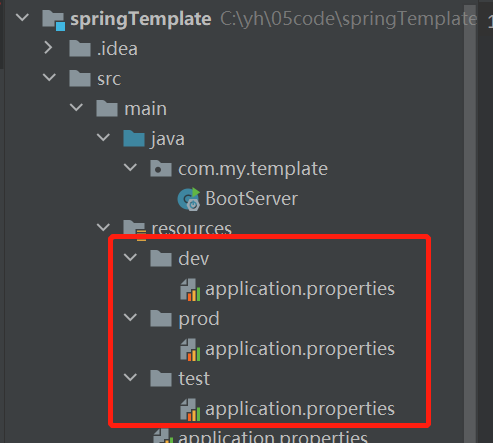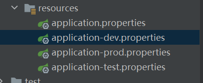 在resources目录下新建application-dev.properties、application-test.properties、application-prod.properties三个配置文件,注意application.properties文件一定要存在,因为它是默认的配置文件。思考下如果没有application.properties文件,有什么方法可以实现不同环境的配置文件切换,答案是前边说的“spring.config.name”和“spring.config.location”这两个属性,不同环境配置不同的文件名即可。继续看三个配置文件,
