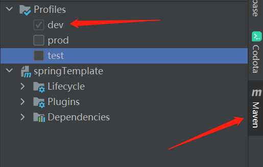 </project>在pom.xml文件中加入了上面的配置,idea的”maven“界面,发生了下面的变化,默认是上面配置的”dev“,