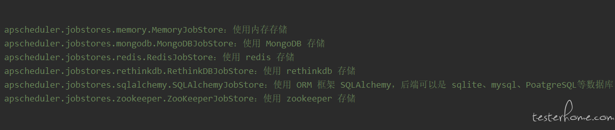 作业存储 (job store)作业存储存储被调度的作业,默认的作业存储是简单的将作业保存到内存中,如果选择其他方式也可以将作业保存到数据库中;一个作业数据的保存将会在持久化作业存储的时候被序列化,然后在加载时被反序列化;调度器无法分享同一个作业存储。