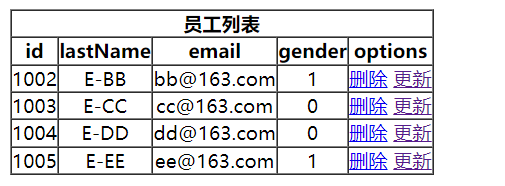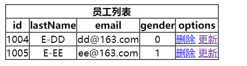 </html>这里仍然采用拼接的方式@{/employee/} ${employee.id},这样 thymeleaf 才可以正确解析。